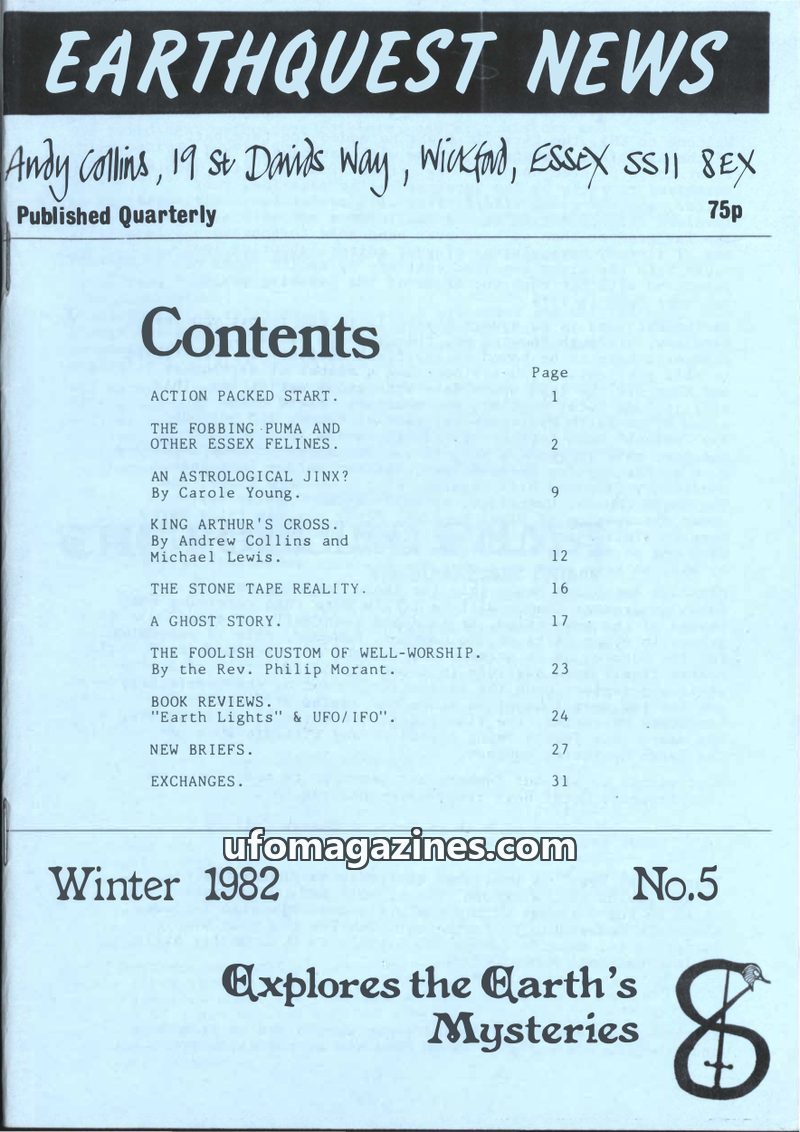 This issue of Earthquest News explores various mysteries, including alleged puma sightings in Essex, astrological influences on global events, the discovery and history of a purpor