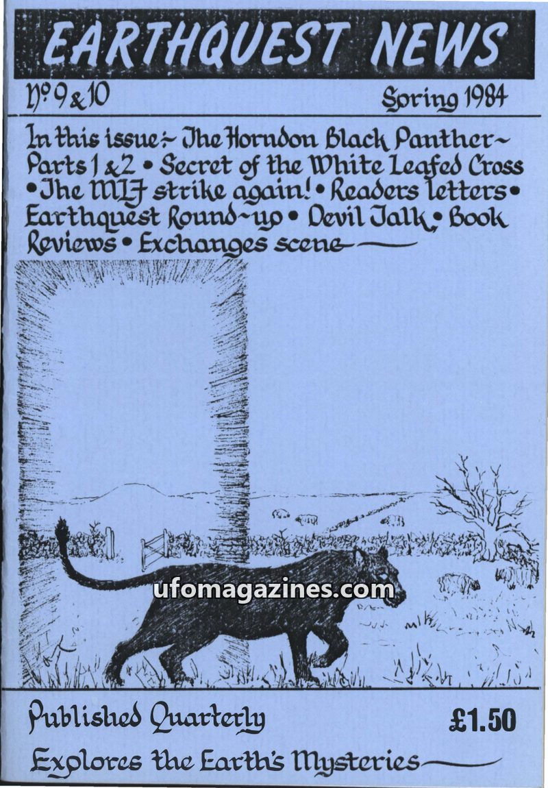 This issue of Earthquest News focuses heavily on the sightings of a black panther-like beast in South East Essex during late 1983. It details three primary sightings, including tho