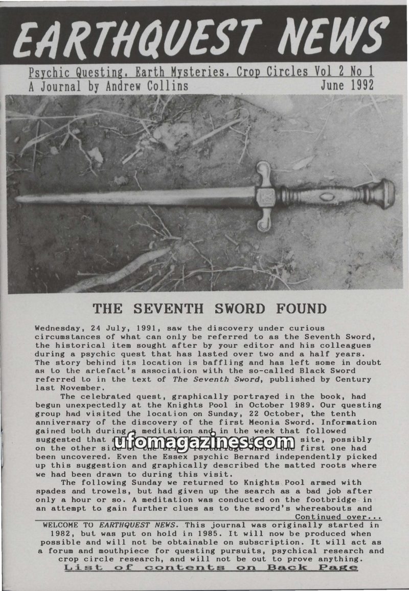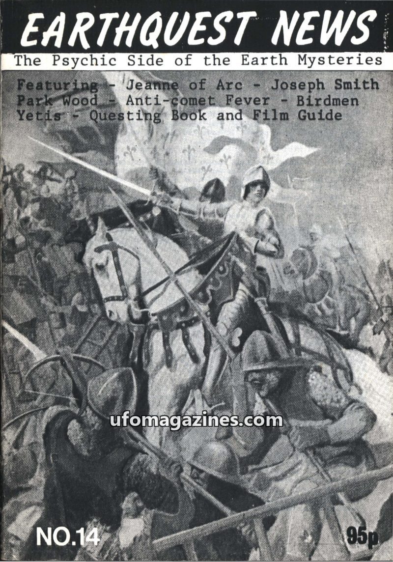 This issue of Earthquest News delves into various earth mysteries and psychic phenomena. It features a report on Jeanne d'Arc's discovery of her sword through psychic means and her