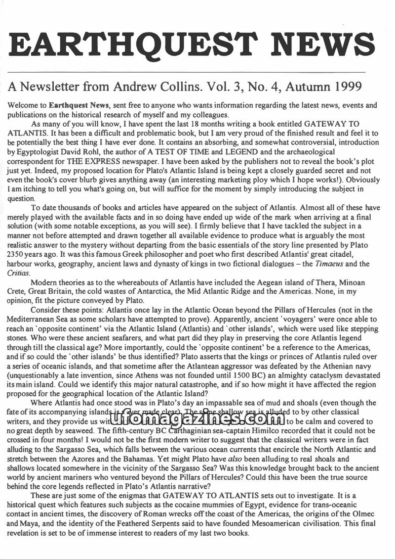 This issue of Earthquest News focuses on Andrew Collins' new book, 'Gateway to Atlantis,' which proposes a new location for the lost continent beyond the Pillars of Hercules and su