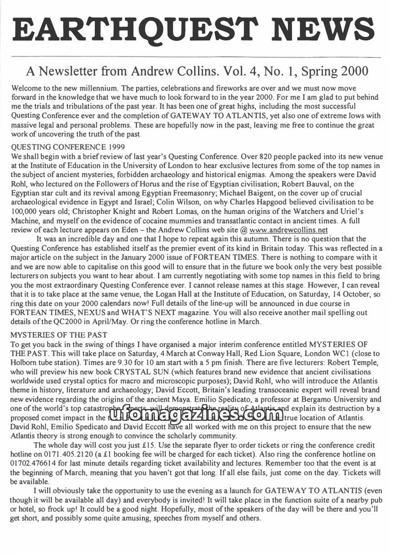 This issue of Earthquest News, dated Spring 2000, covers upcoming conferences like the Questing Conference 1999 review and 'Mysteries of the Past'. It features detailed discussions