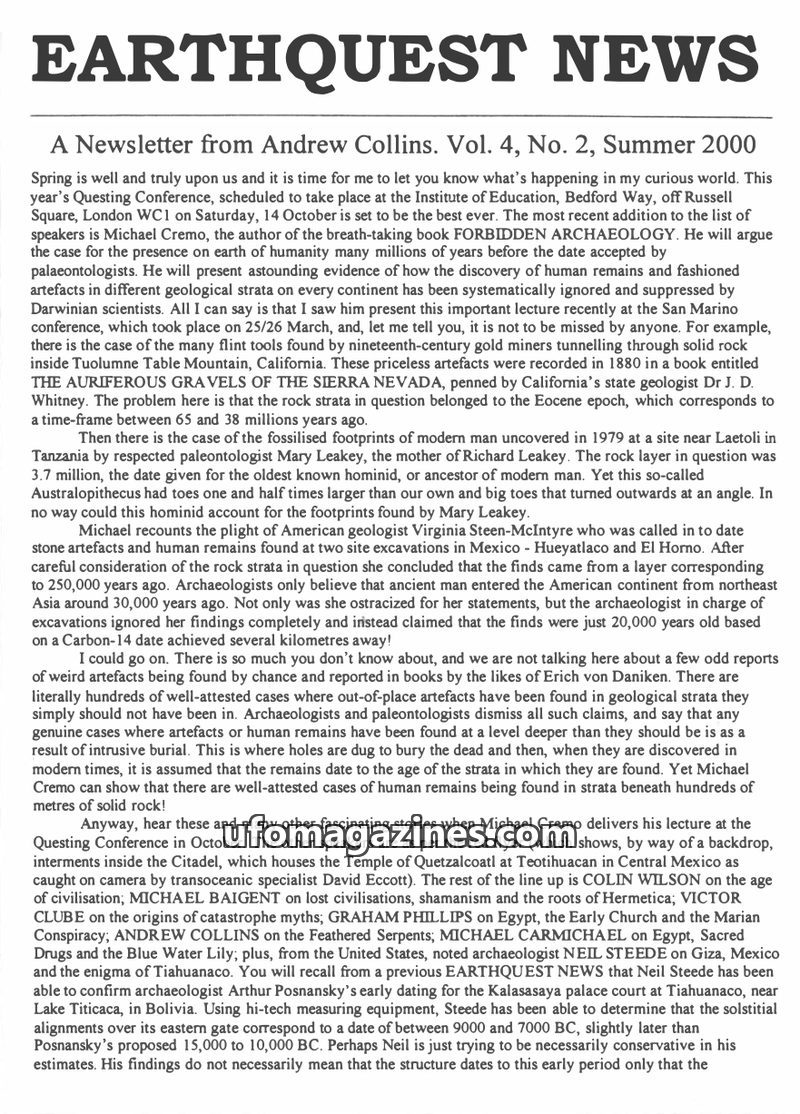 This issue of Earthquest News covers several intriguing topics related to ancient history and unexplained phenomena. It highlights the upcoming Questing Conference featuring Michae