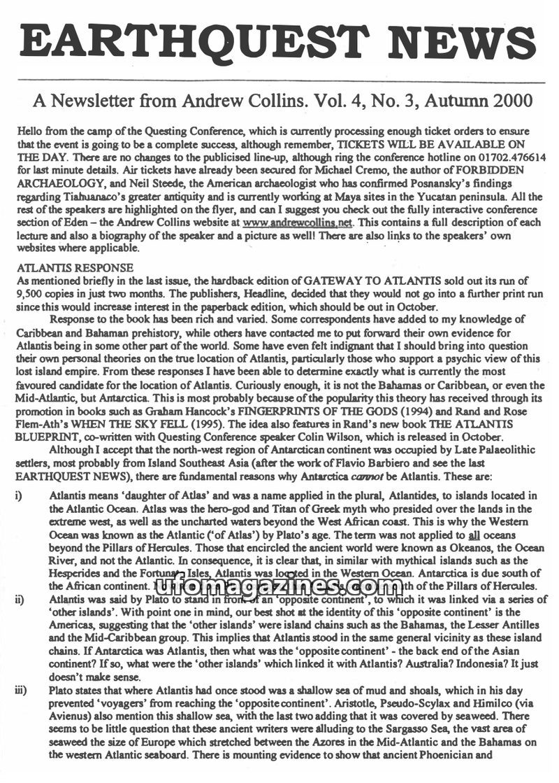This issue of Earthquest News discusses the ongoing Questing Conference and the popular theories regarding the location of Atlantis, with Antarctica, the Caribbean, and the Azores