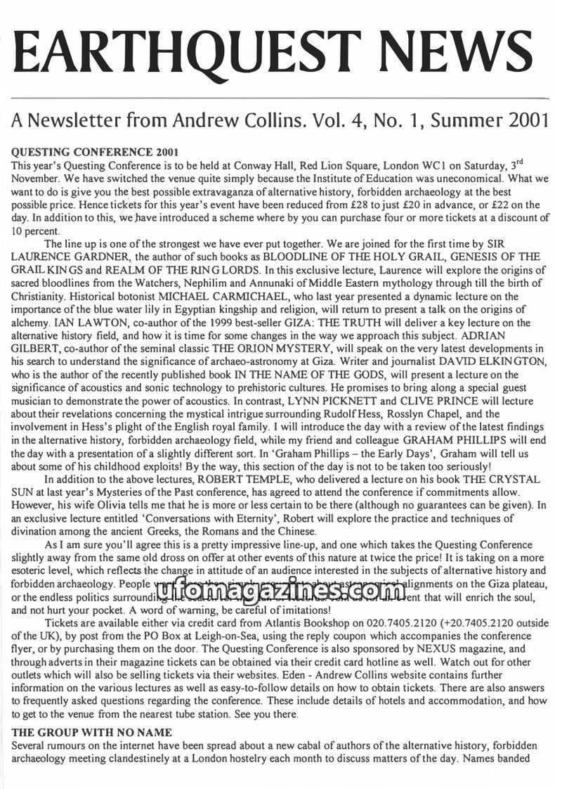 This issue of Earthquest News covers the upcoming Questing Conference 2001, highlighting speakers like Sir Laurence Gardner and Robert Temple. It delves into the 'group with no nam
