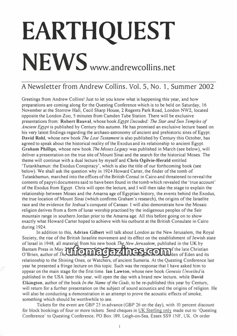 The Summer 2002 issue of Earthquest News announces the upcoming Questing Conference in London, featuring presentations by authors like Robert Bauval, David Rohl, and Graham Phillip