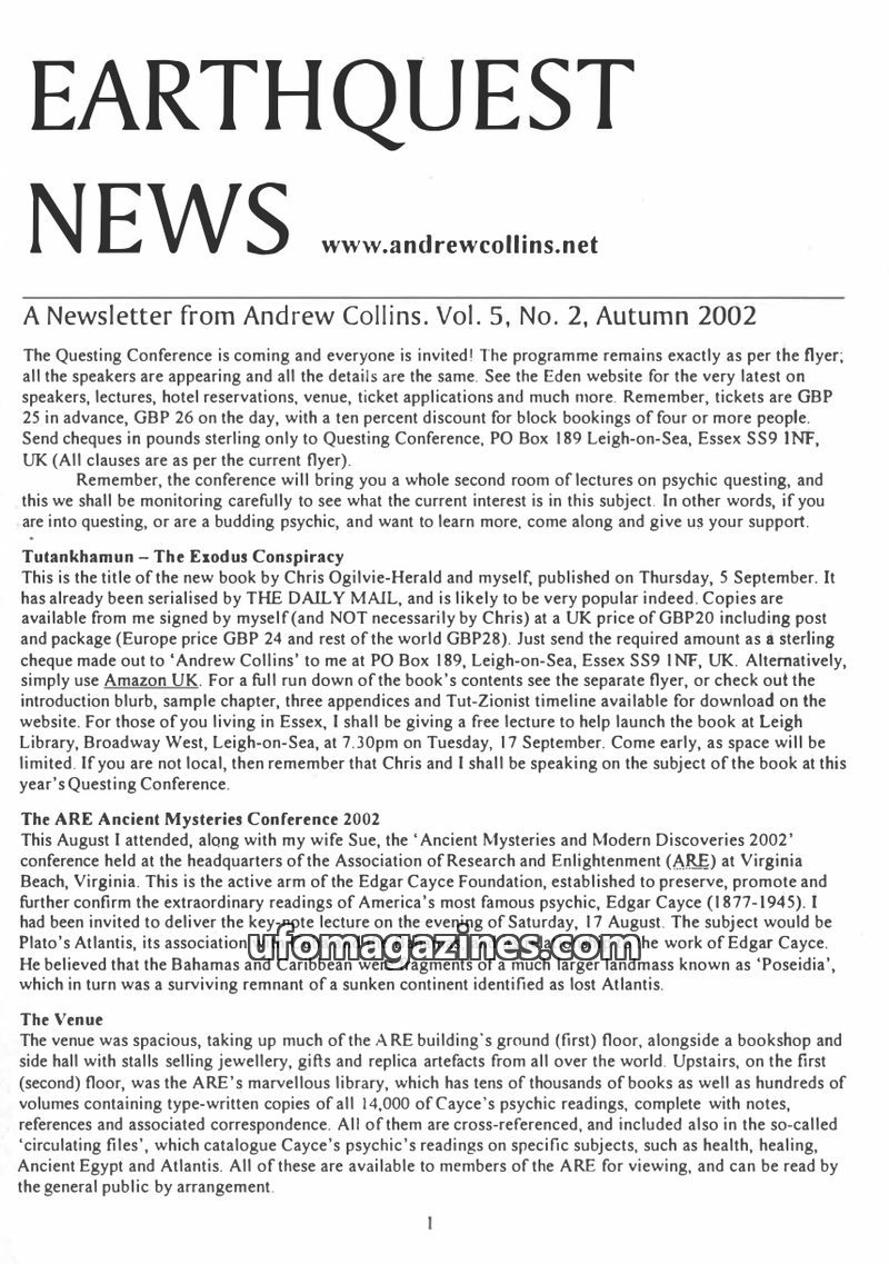 This issue of Earthquest News covers upcoming events like the Questing Conference and the launch of the book 'Tutankhamun – The Exodus Conspiracy'. It details a conference attended