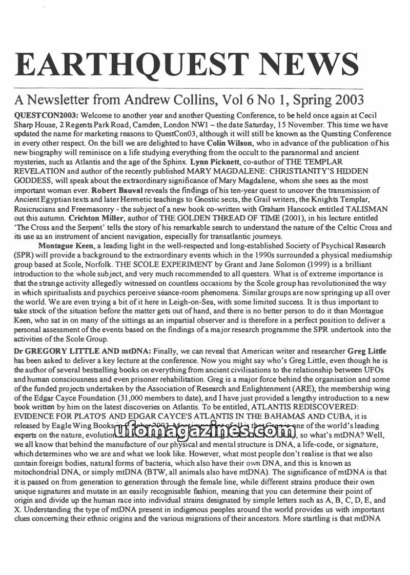 This issue of Earthquest News announces QuestCon2003, a conference featuring speakers like Colin Wilson, Lynn Picknett, Robert Bauval, and Greg Little. Greg Little will present on