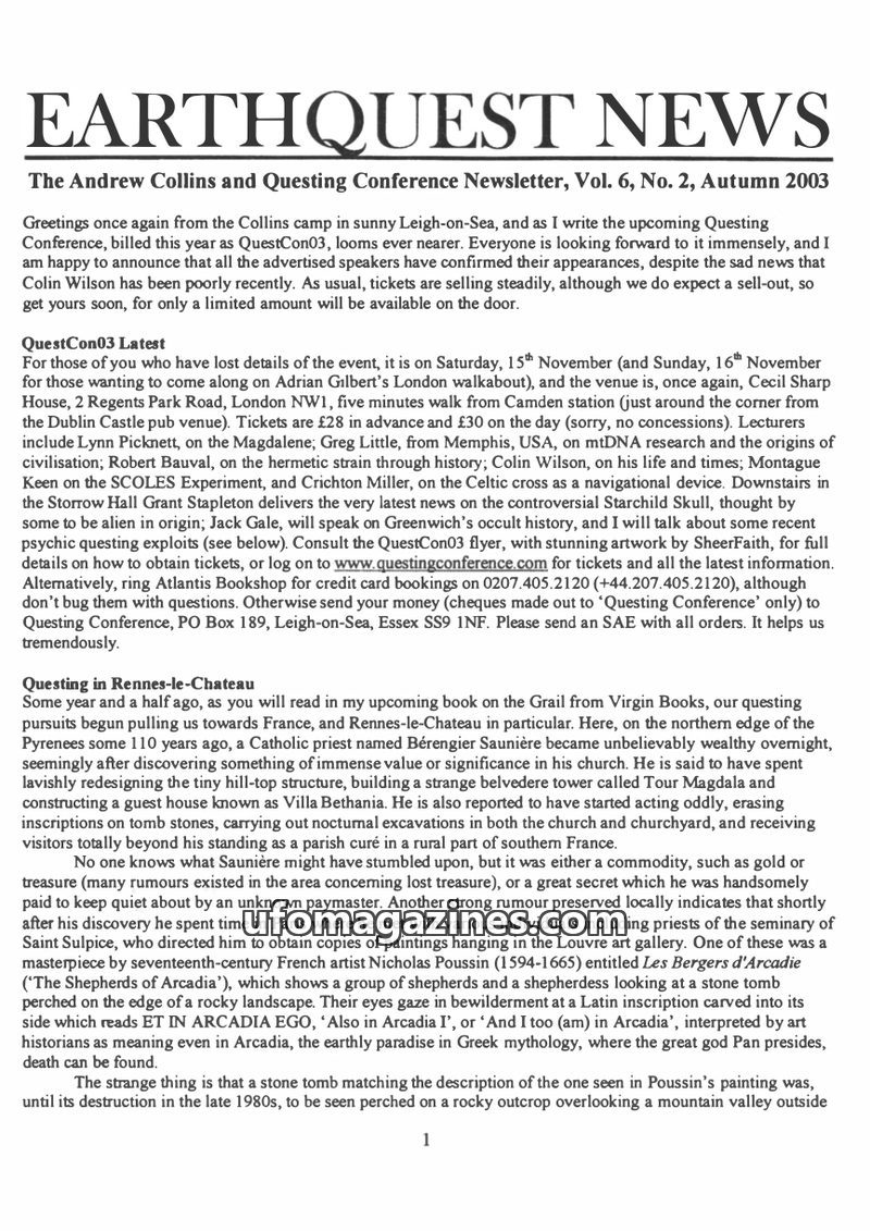 This issue of Earthquest News covers the upcoming QuestCon03 conference, detailing speakers and ticket information. It delves into the enduring mystery of Rennes-le-Chateau, explor