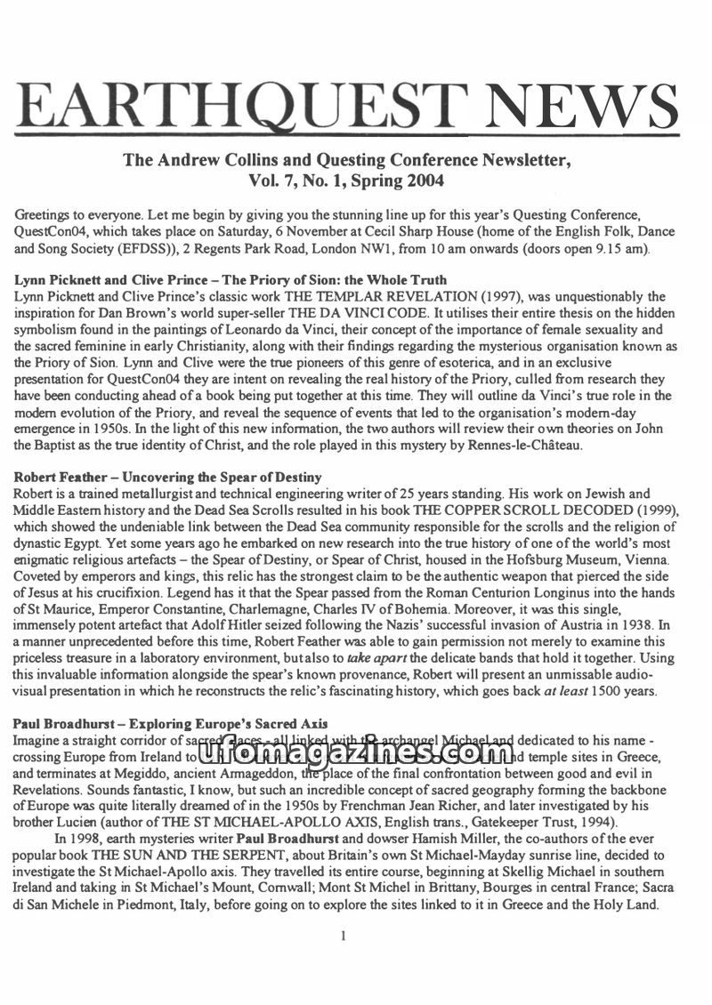 This issue of Earthquest News previews the upcoming QuestCon04 conference, highlighting presentations by experts on diverse esoteric topics. Speakers include Lynn Picknett and Cliv