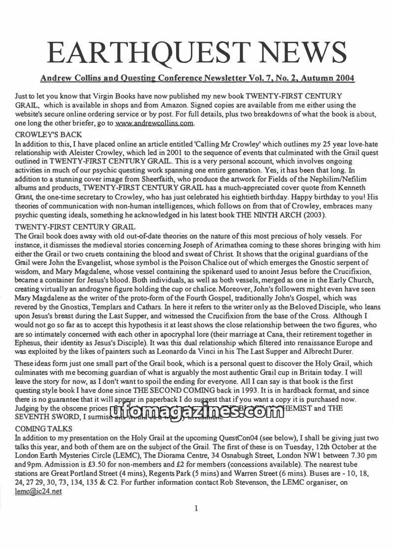 This issue of Earthquest News announces Andrew Collins' new book, 'Twenty-First Century Grail,' which re-examines Grail lore and its connections to figures like John the Evangelist