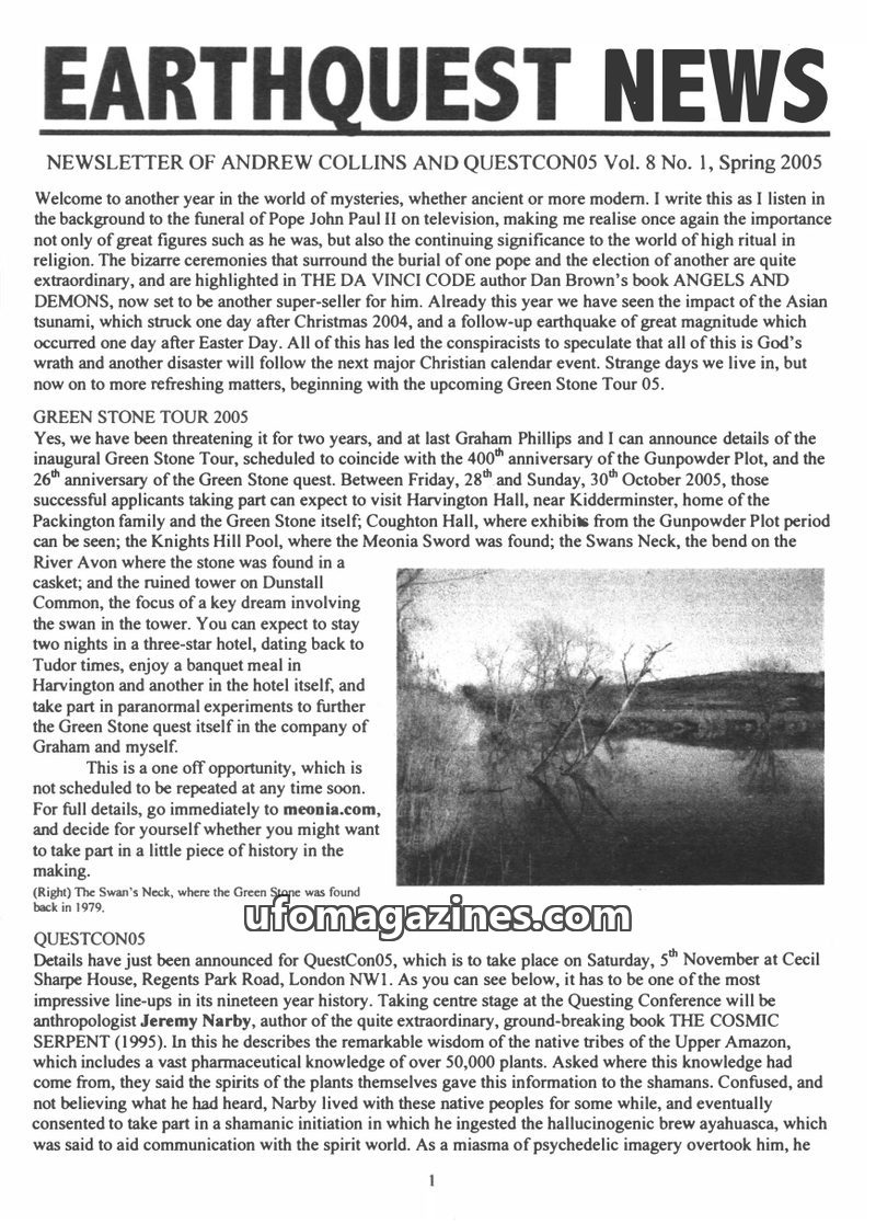 This issue of Earthquest News covers the upcoming QuestCon05 conference, detailing speakers such as anthropologist Jeremy Narby discussing plant consciousness and shamanism, Stan G