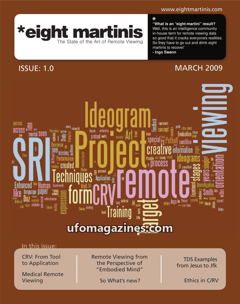The inaugural issue of 'eight martinis' magazine, dated March 2009, focuses on the field of remote viewing. It introduces the concept of an 'eight-martini result' as data so profou
