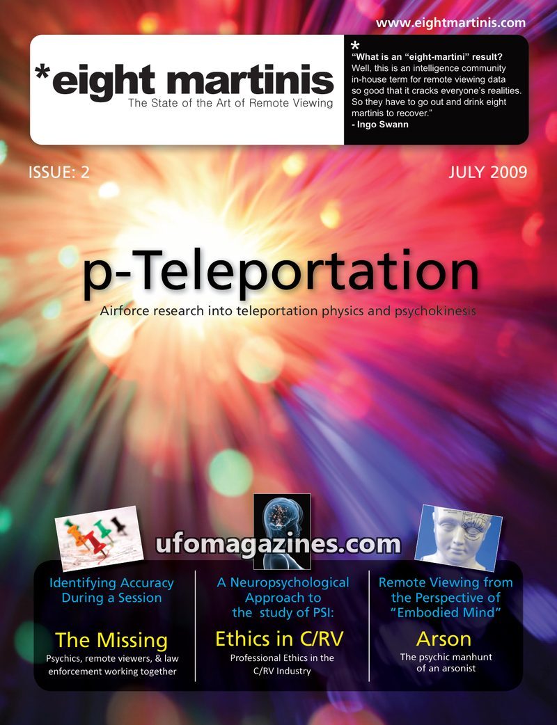 This issue of 'Eight Martinis' delves into various aspects of remote viewing and psi phenomena. It features an article on 'p-Teleportation' exploring Airforce research into telepor