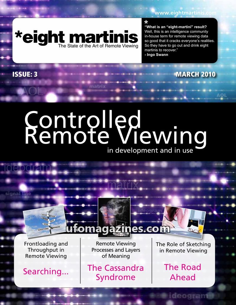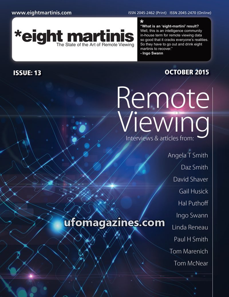 This issue of eight martinis (April 2016) delves into various aspects of remote viewing (RV). It includes an interview with a Project Star Gate remote viewer, discussions on CRV st