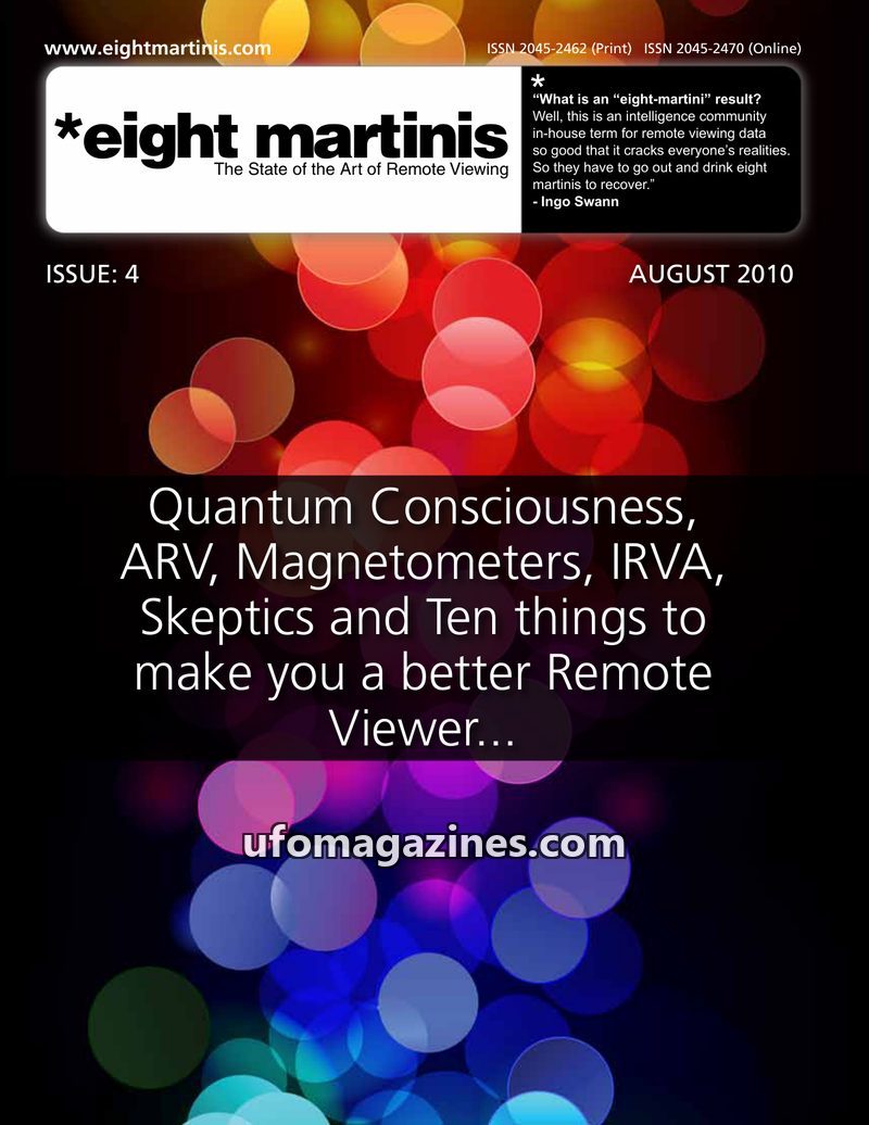 This issue of 'eight martinis' magazine, dated August 2010, delves into various aspects of Remote Viewing (RV). It features articles on quantum consciousness, ARV trials, magnetome