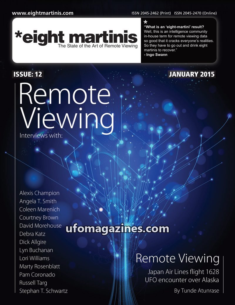 Issue 12 of *eight martinis, dated January 2015, focuses on Remote Viewing (RV) with interviews from prominent figures like Alexis Champion, Angela T. Smith, and others. The magazi