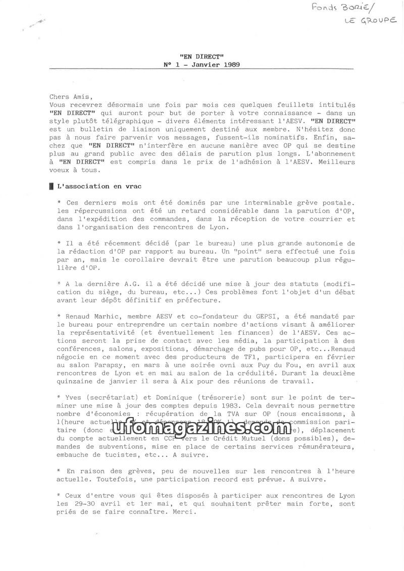 This inaugural issue of "EN DIRECT" from January 1989, published by AESV, aims to inform members about association activities and UFO-related news. It details recent AESV decisions
