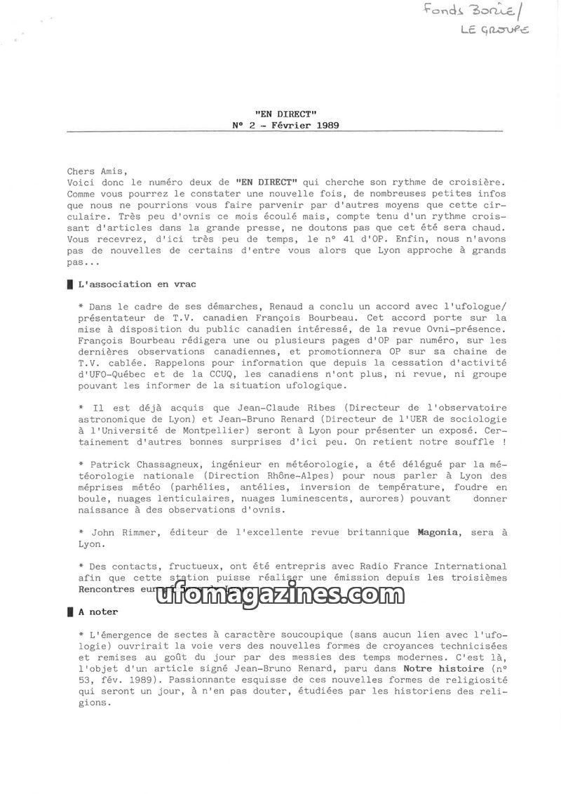 This issue of 'EN DIRECT' highlights ongoing UFO reports and increasing media attention. It details an agreement with Canadian ufologist François Bourbeau to feature Canadian obser