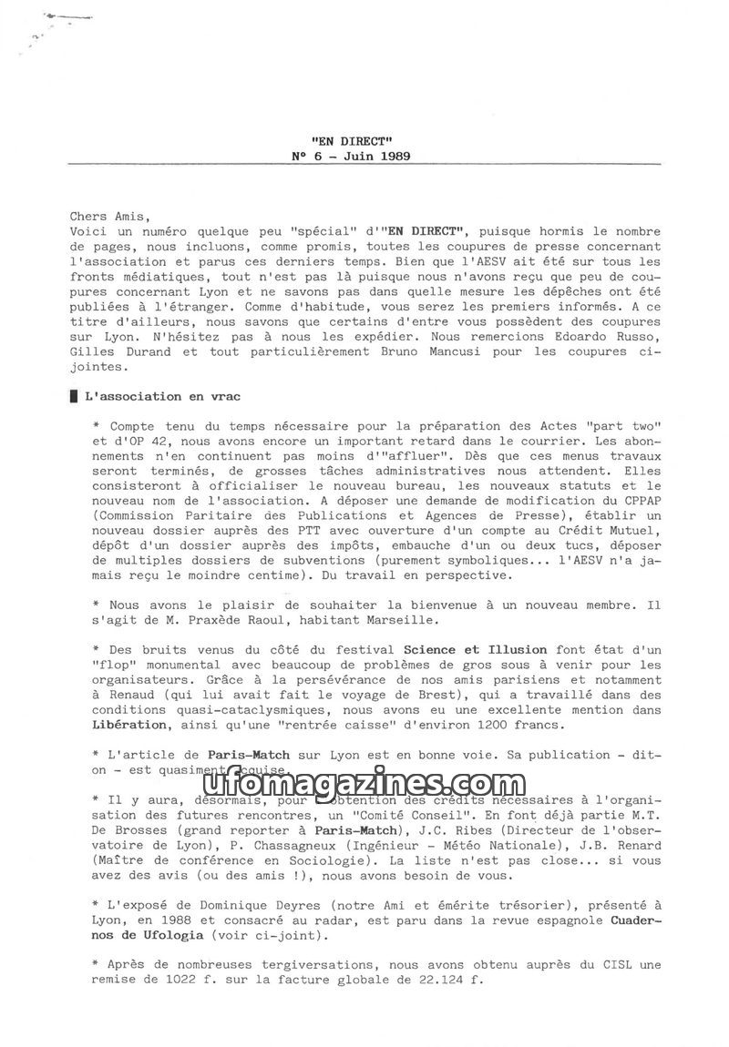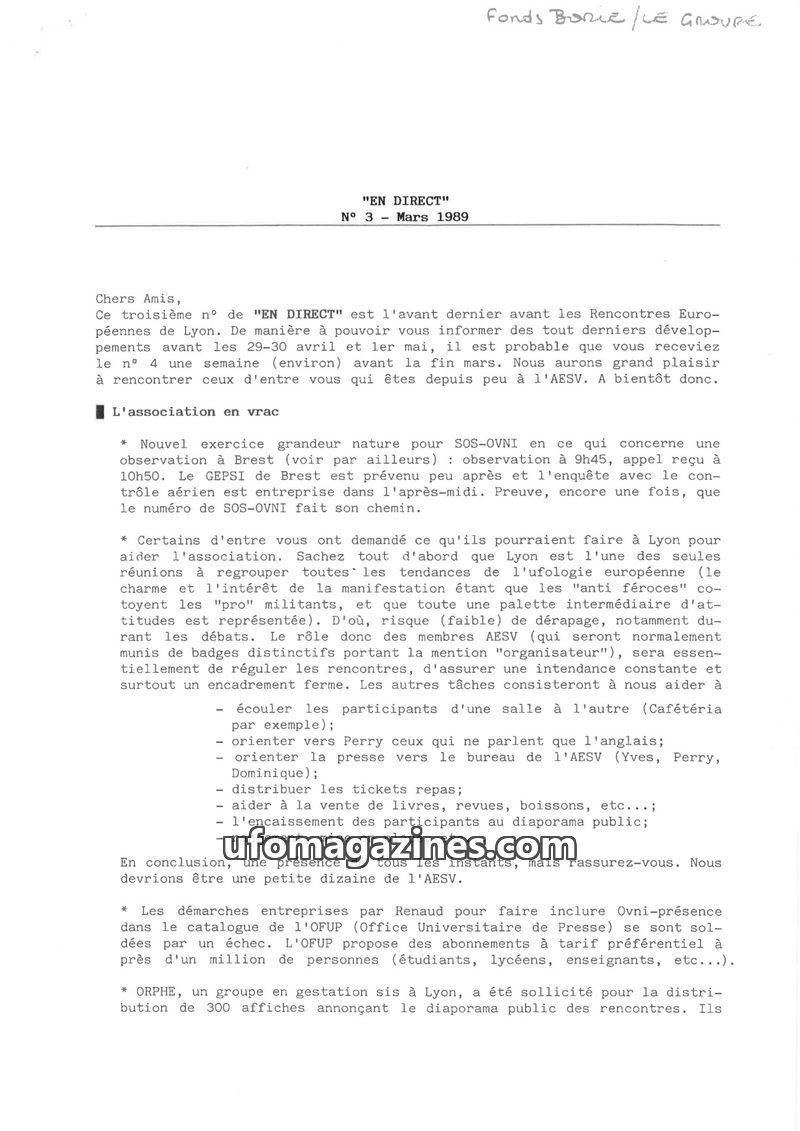 This issue of EN DIRECT, dated March 1989, focuses on preparations for the European UFO conference in Lyon and reports on recent UFO sightings. It details the roles of AESV members