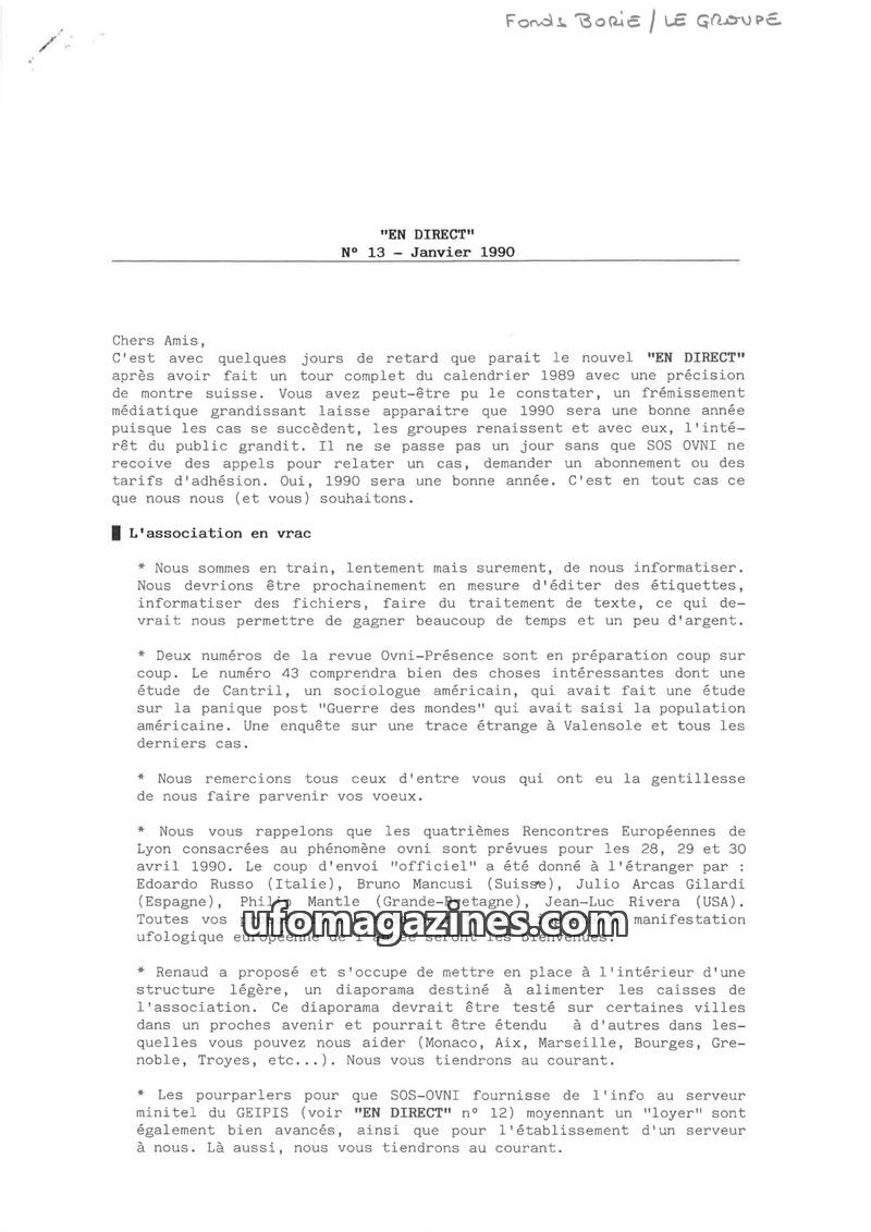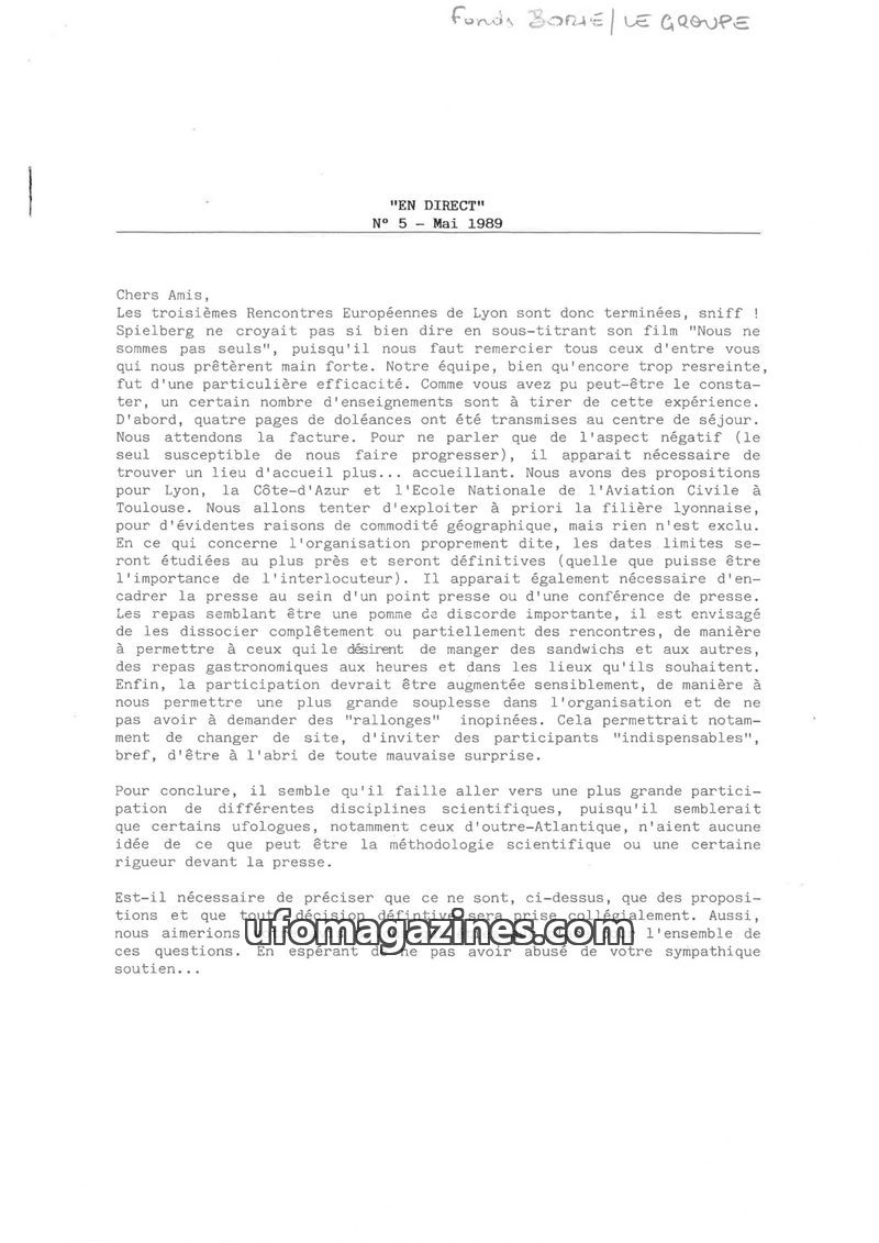 This issue of EN DIRECT covers preparations for UFO encounters in Lyon, including fundraising for Bill Moore's travel and reaching 80 registrations. It highlights recent UFO report