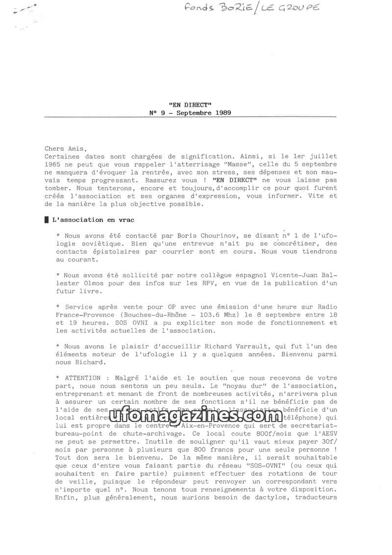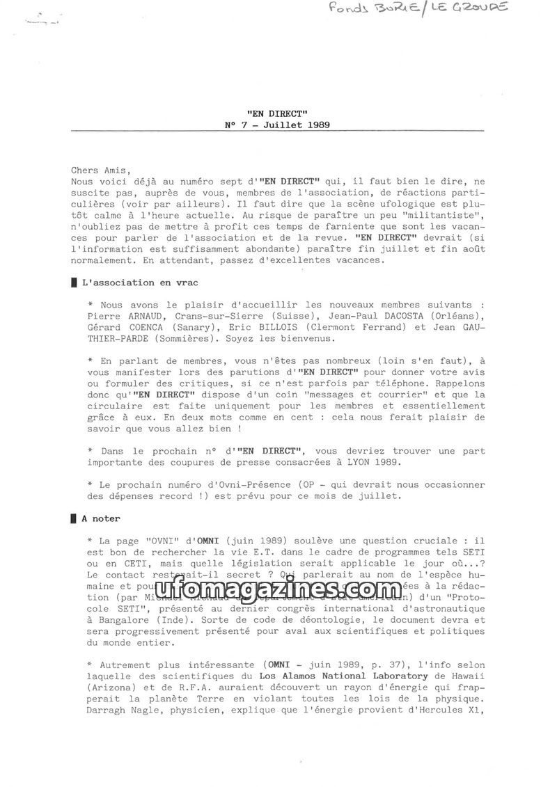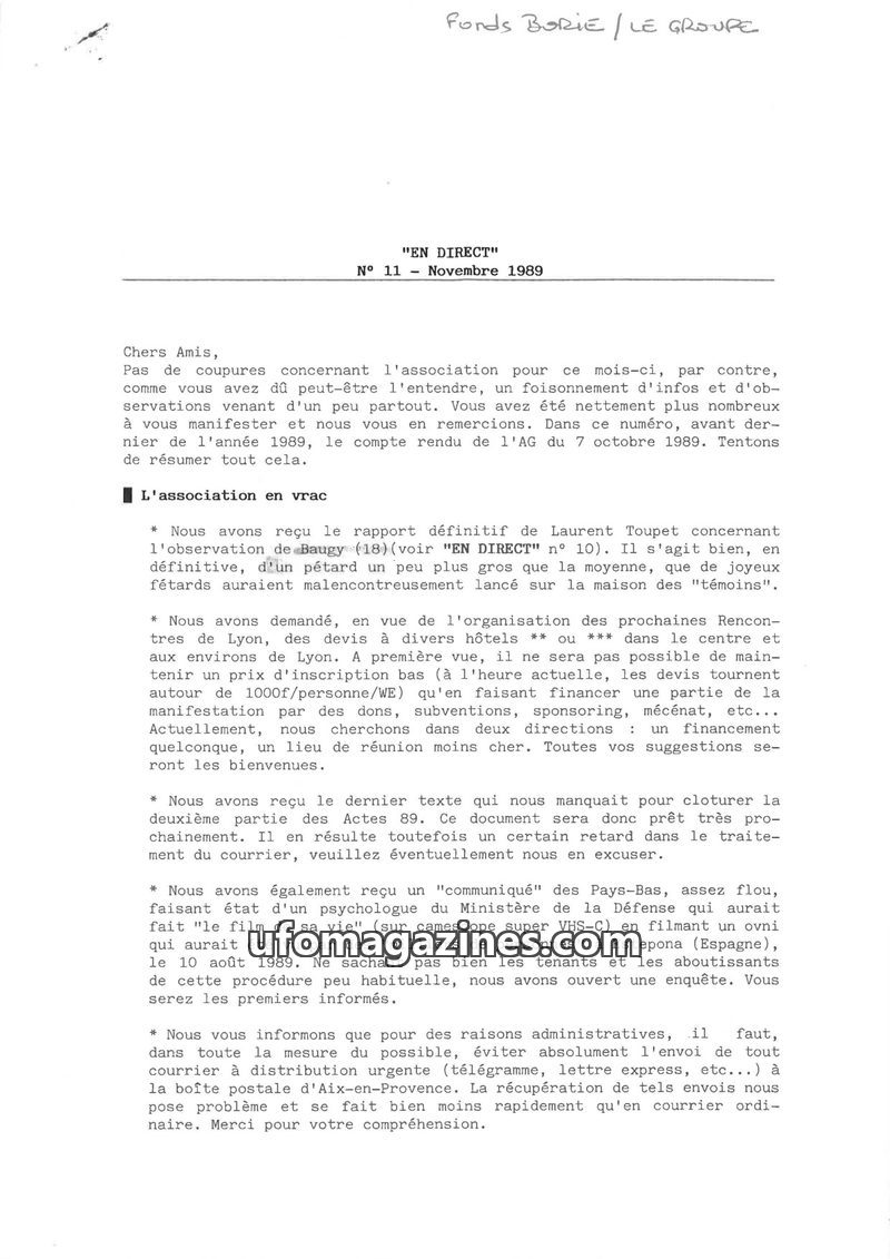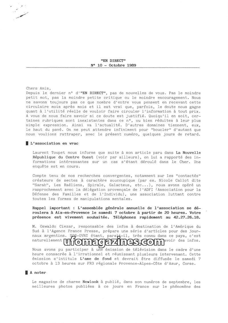 This issue of EN DIRECT, dated October 1989, addresses reader feedback and highlights ongoing investigations into UFO phenomena. It reports on a case in the Cher region, a collabor