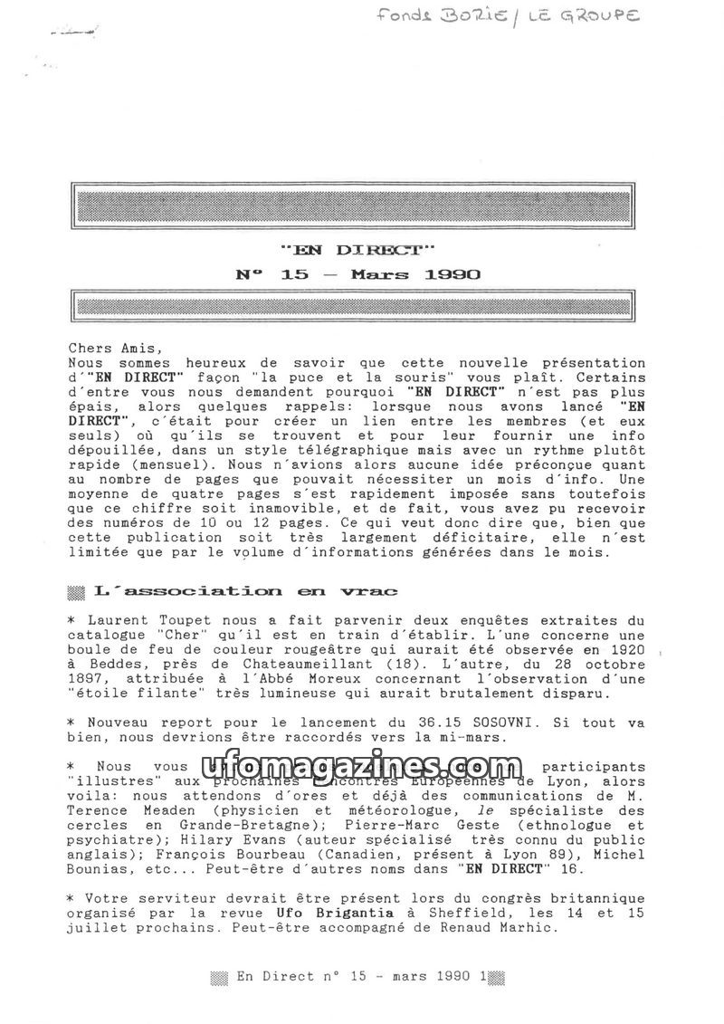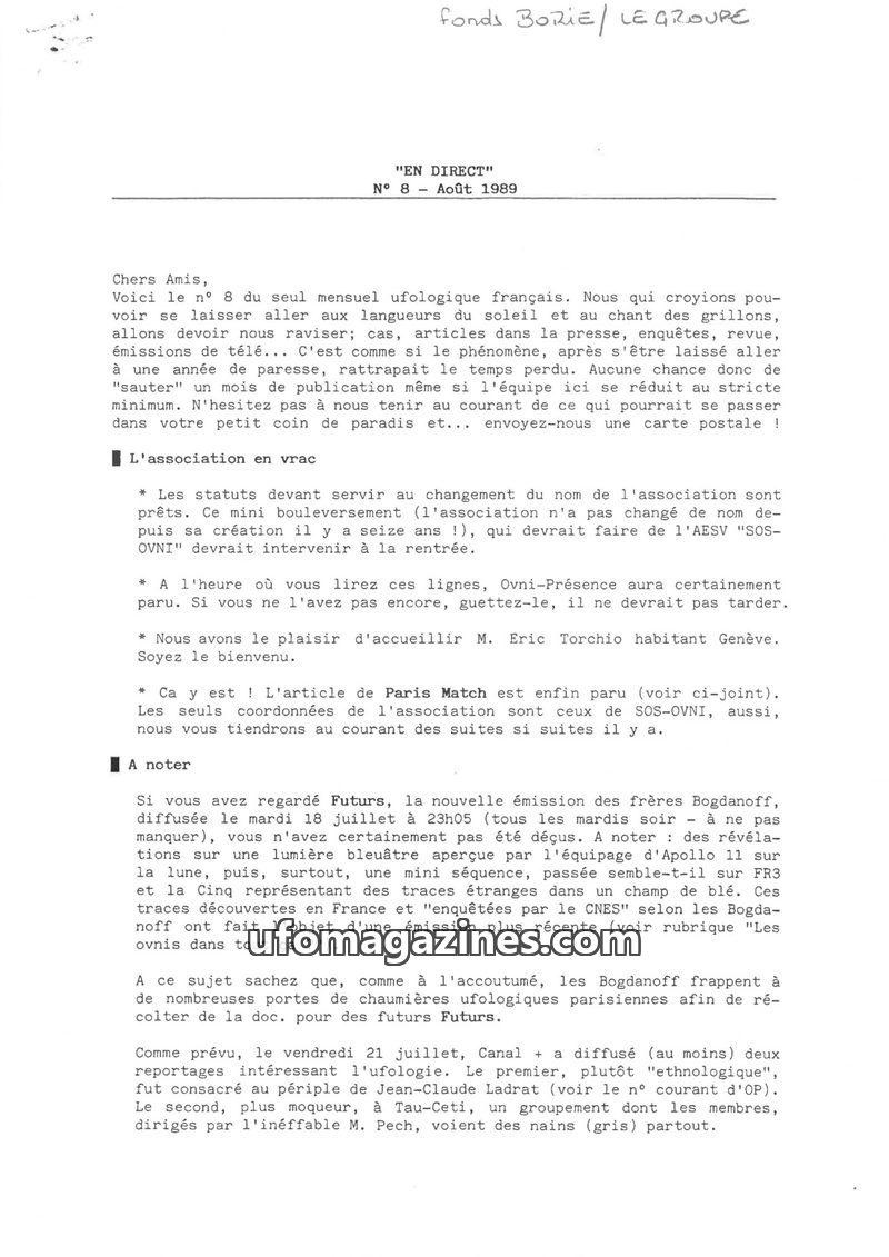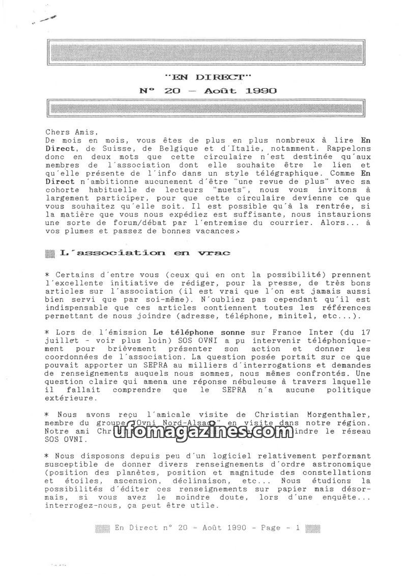 The August 1990 issue of 'En Direct' highlights the growing readership and encourages participation from its members. It covers various UFO-related news, including media appearance
