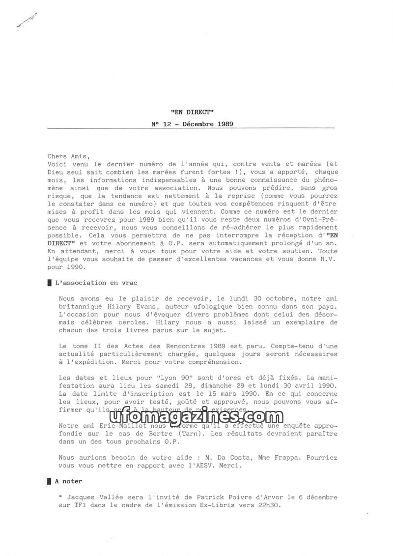 The December 1989 issue of 'EN DIRECT' concludes the year with updates on UFO research and related phenomena. It highlights the visit of British ufologist Hilary Evans, discusses t