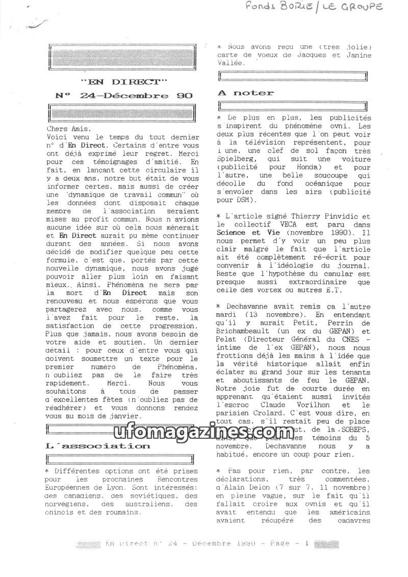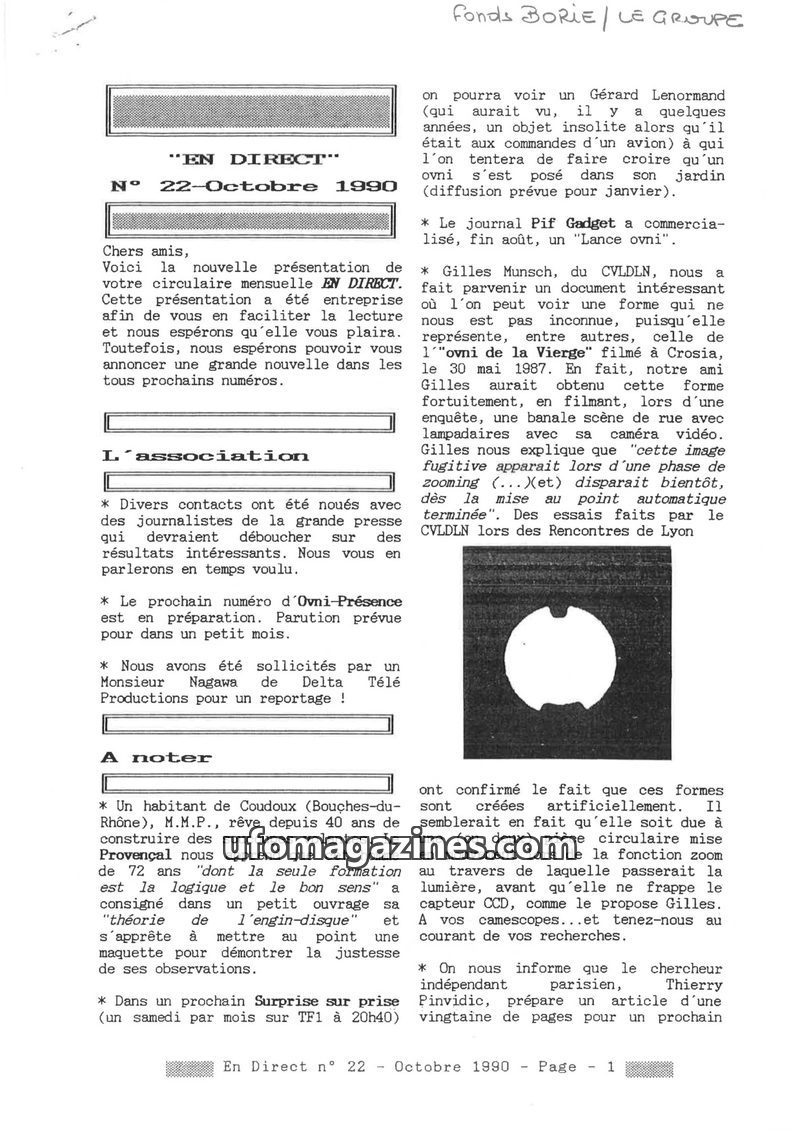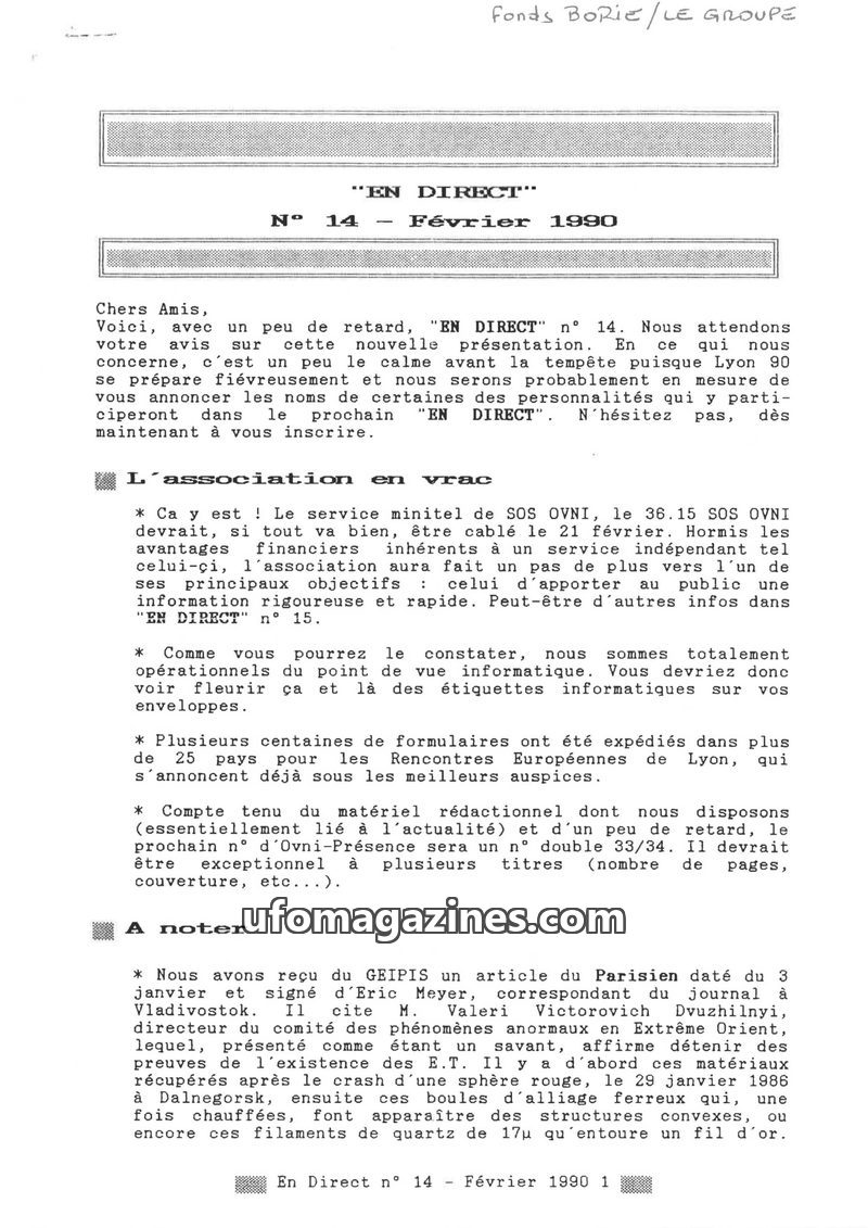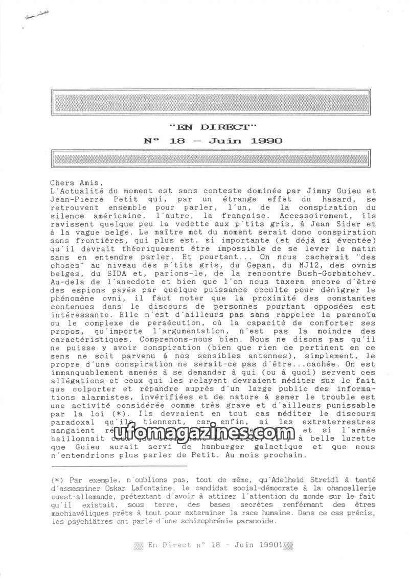 This issue of EN DIRECT covers various UFO-related topics, including reports of sightings in France and Germany, and the ongoing work of ufology associations. It also touches upon
