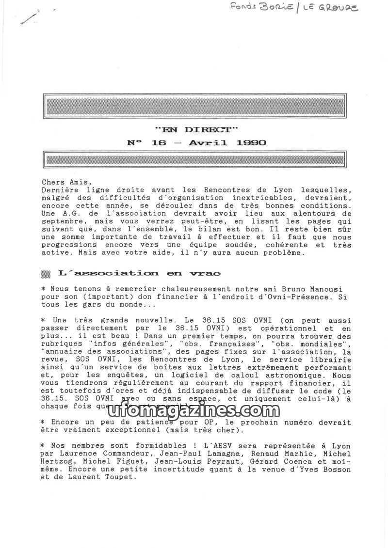 This issue of EN DIRECT from April 1990 provides updates on the upcoming 'Rencontres de Lyon' UFO conference, highlighting organizational efforts and the launch of the '36.15 SOS O
