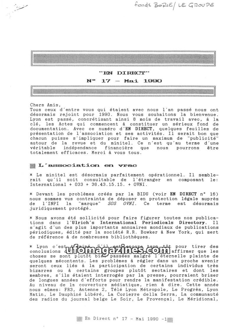 This issue of EN DIRECT from May 1990 details the association's progress, including the operational Minitel service and the legal protection of the 'SOS OVNI' trademark. It covers