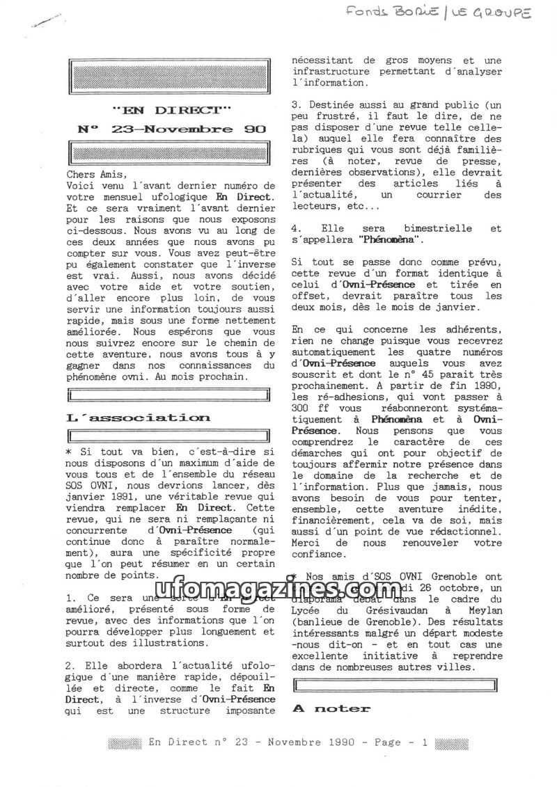 This issue of 'En Direct' announces its final publication, with the next issue being the last. It details the launch of a new, more comprehensive ufology magazine called 'Phénomèna