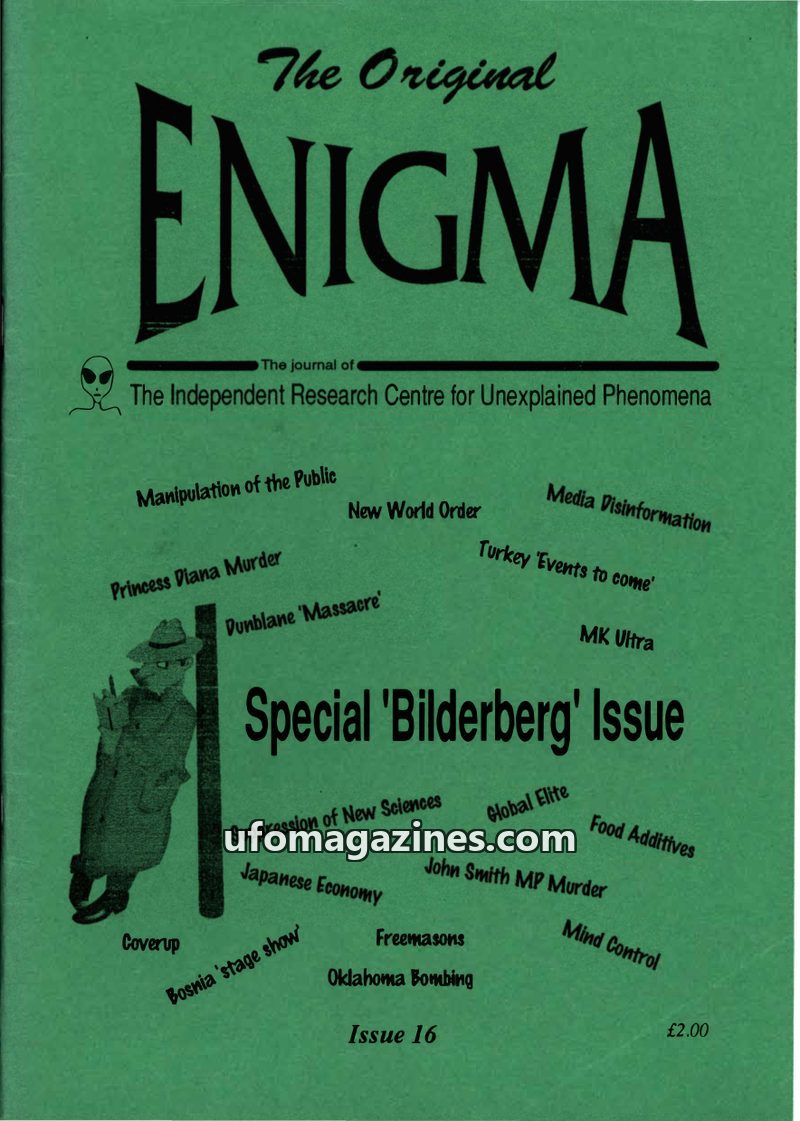This issue of The Original ENIGMA focuses on the Bilderberg Group, presenting it as a shadowy organization controlling world events. The magazine explores alleged connections betwe