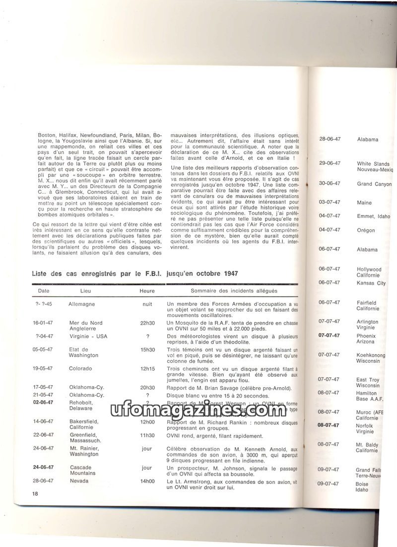 This issue of Flying Saucers magazine delves into FBI UFO reports from October 1947, presenting a chronological list of alleged incidents. It highlights the contrast between public