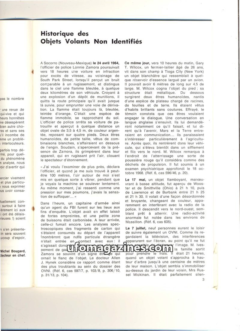 This issue delves into the history of unidentified flying objects, detailing several significant sightings and encounters from the 1960s. It covers the well-known Socorro incident