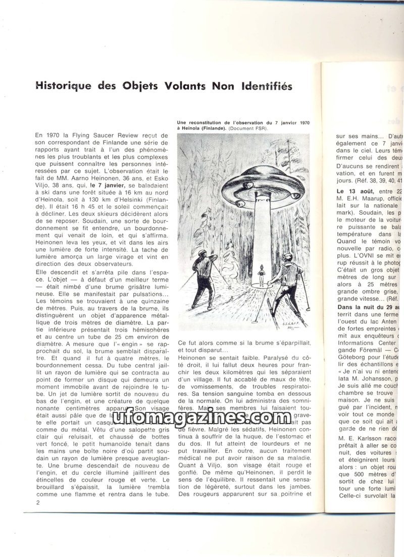 This issue details several significant UFO sightings from the 1970s. A 1970 Finnish sighting involved a luminous object, a humanoid figure, and subsequent physical distress for the