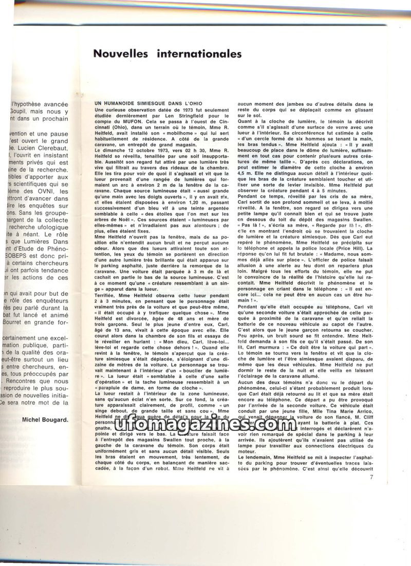 This issue of 'Nouvelles internationales' (March 1975) details several international UFO and humanoid encounters. A key report describes a simian-like humanoid observed in Ohio in