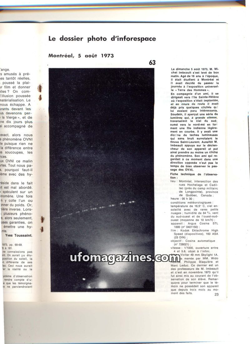 This issue of 'inforespace' magazine focuses on UFO (OVNI) sightings, particularly a photo case from Montreal on August 5, 1973, and a series of Belgian sightings from mid-August 1