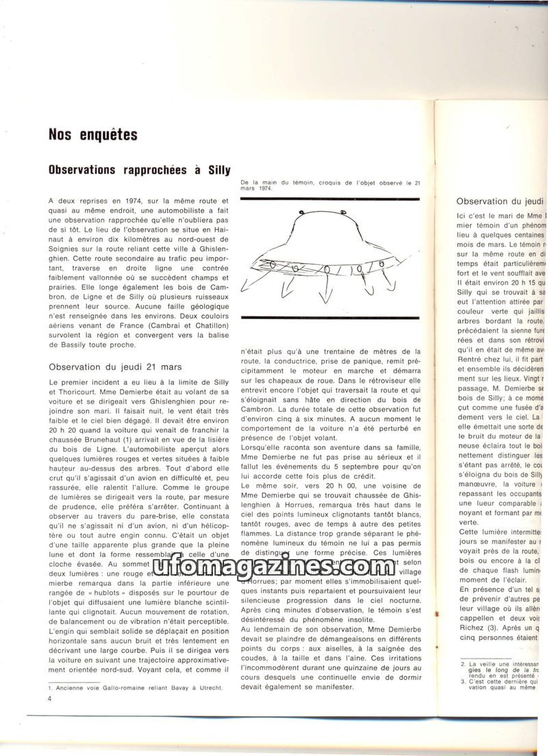 This issue details several close UFO encounters, focusing on two primary cases: the Silly, Belgium sightings in 1974 and the New Berlin, USA case in 1964. The Silly incidents invol