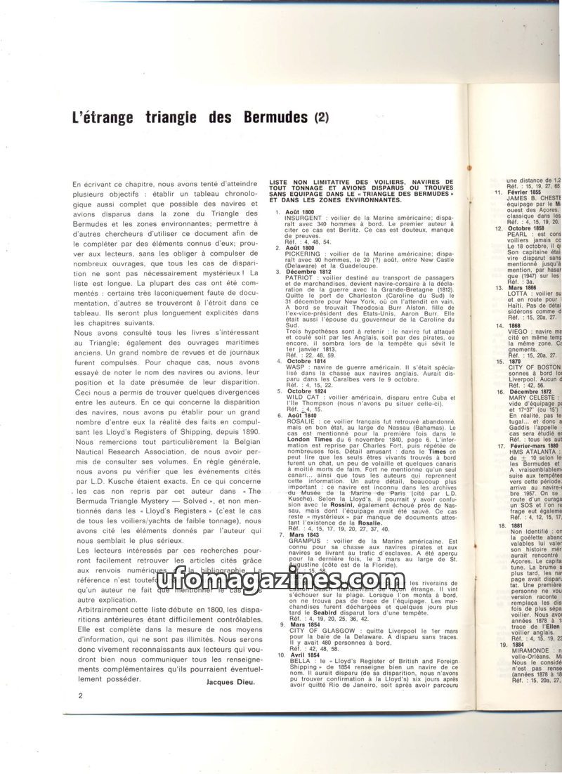 This issue presents a detailed, non-exhaustive chronological list of maritime and aviation disappearances in and around the Bermuda Triangle, starting from 1800. The author, Jacque