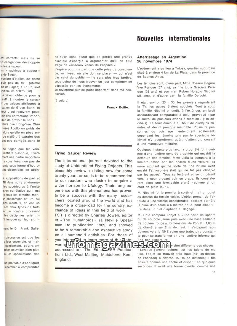 This issue of Flying Saucer Review covers international UFO phenomena, including a detailed account of an event in Tolosa, Argentina, on November 26, 1974, involving multiple witne