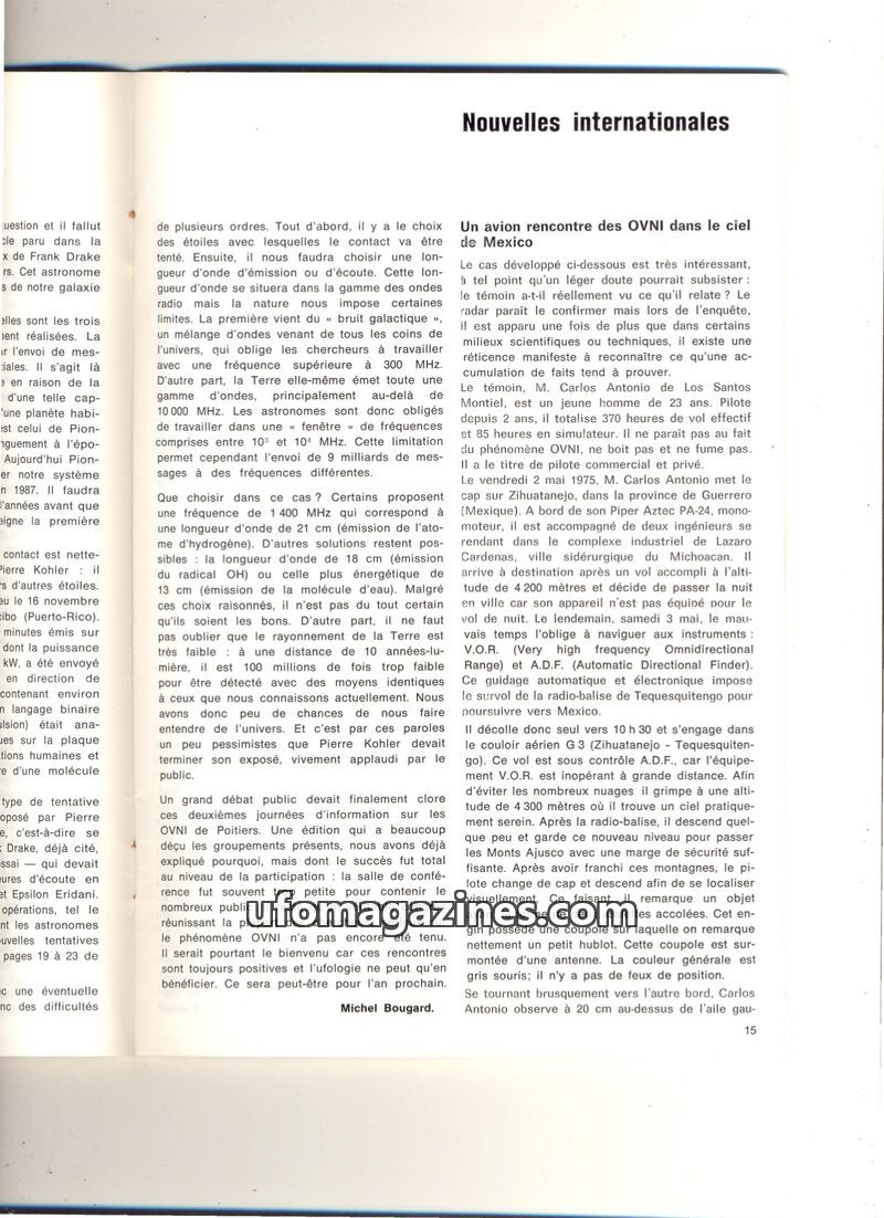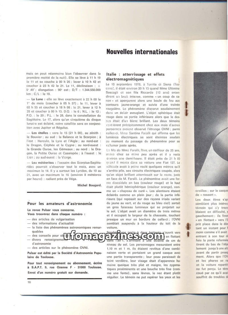 This issue of 'Nouvelles internationales' delves into various UFO sightings and encounters across different countries. A significant event in Italy involved a landing and humanoid
