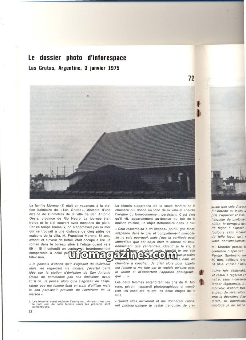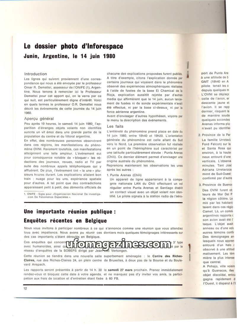 This issue details the Las Grutas, Argentina UFO case from January 3, 1975, where Francisco Moreno photographed a stationary, humming object. It also includes reports from Belgium