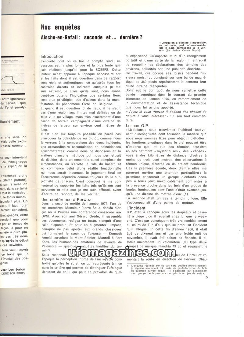 This issue of 'Nos enquêtes' delves into several UFO/UAP cases, primarily focusing on two incidents in Aische-en-Refail, Belgium, from 1966 and 1974, which share striking similarit
