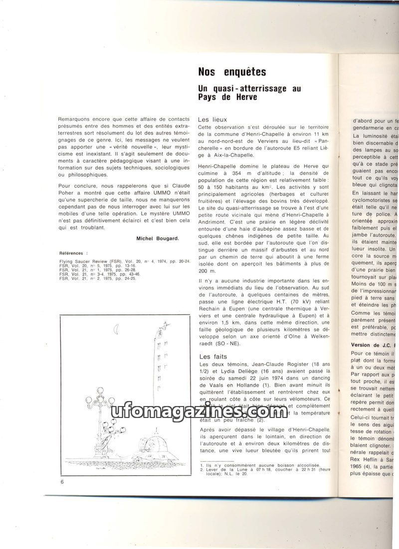 This issue of Flying Saucer Review details a 'quasi-landing' incident in the Pays de Herve, Belgium, on June 22, 1974. Two young witnesses, Jean-Claude Rogister and Lydia Deliège,