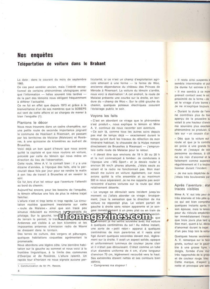 This issue of Inforespace details a 1965 incident in Brabant, Belgium, where witness Mme A.V. reported her car levitating and experiencing steering issues, accompanied by a luminou