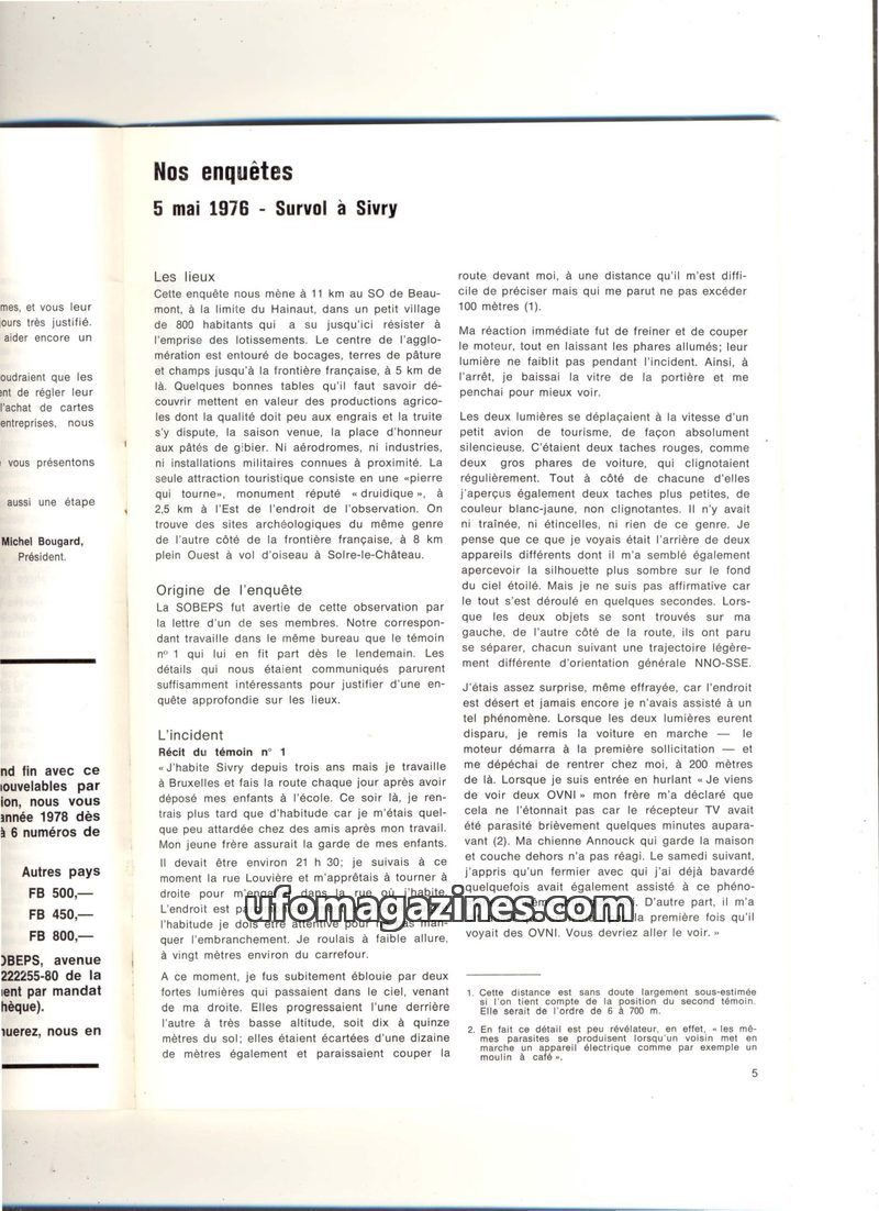 This issue of 'Nos enquêtes' details UFO sightings in Sivry, Belgium, on May 5, 1976, with two independent witnesses describing lights in the sky. The report includes detailed acco