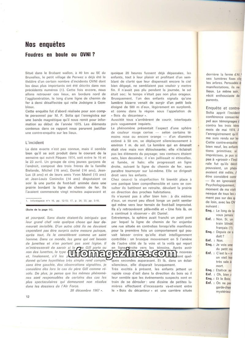 This issue of 'Nos enquêtes' investigates a UFO sighting in Perwez, Belgium, involving a luminous sphere witnessed by five boys. It also delves into the phenomenon of ball lightnin