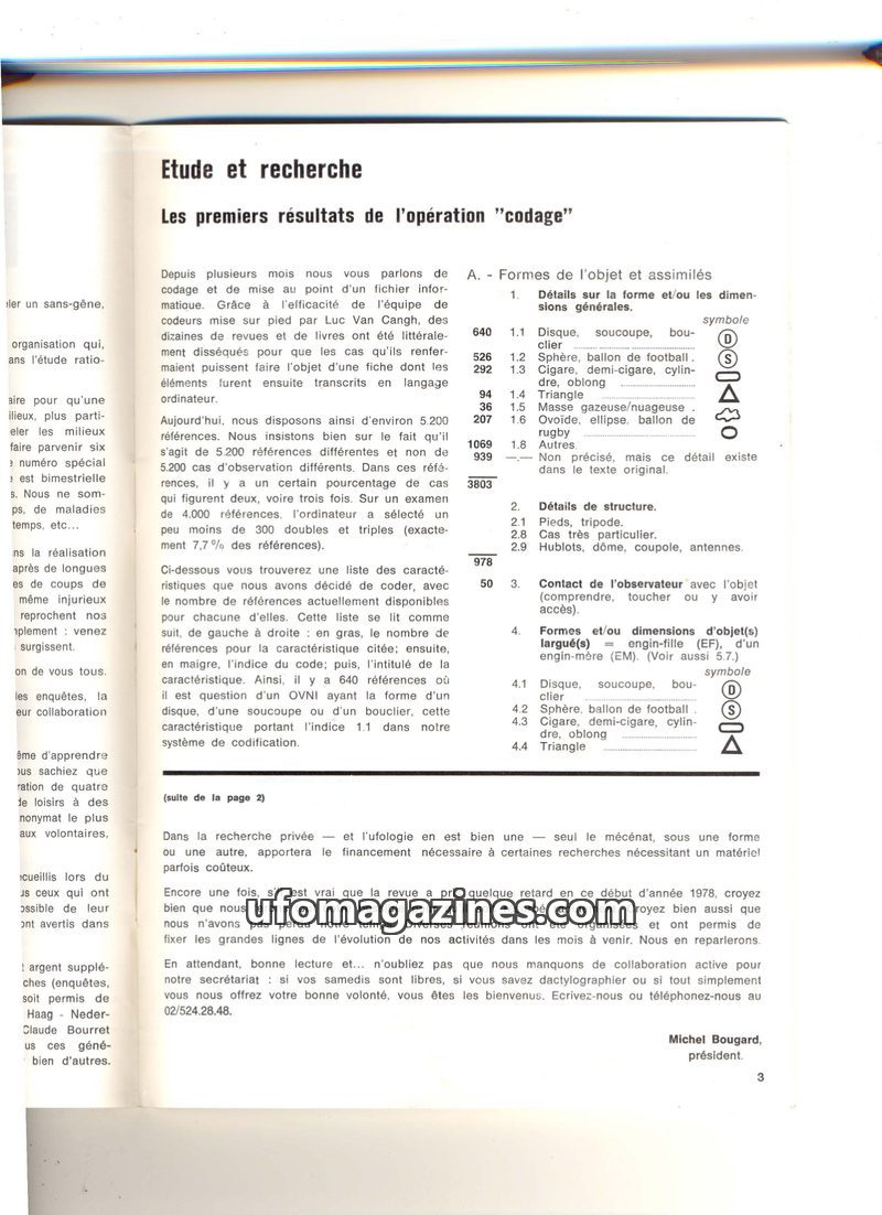 This issue of 'Etude et recherche' details the results of a UFO 'coding' operation, cataloging approximately 5,200 references of UFO sightings and their characteristics. It include
