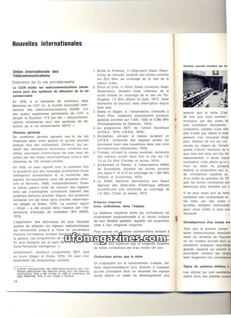 The International Telecommunication Union (ITU) is studying radio communications for SETI (Search for Extraterrestrial Intelligence). Numerous scientific programs are underway glob