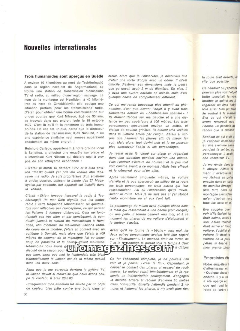This issue details a 1977 sighting in Sweden where Kurt Nilsson encountered three humanoids near a UFO, causing radio and vehicle disturbances. A similar incident in 1969 at the sa